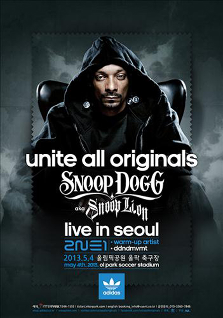 Az amerikai rapper, Snoop Dogg élete első, szöuli koncertjét fogja tartani május 4-én az Olympic Parkban. A vendégfellépő a már az Amerikában is elismert négytagú koreai lánybanda, a 2NE1 lesz.