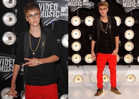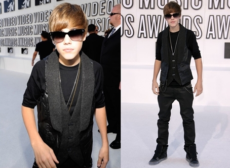 Justin még igazi kisfiúként volt jelen élete első Video Music Awards díjátadóján 2010-ben. A Baby énekese korának megfelelő öltözékben lépett a fotósok elé: fekete pólóban, mellényben, nadrágban és surranókban pózolt a kameráknak. Egyedül hatalmas napszemüvegét nem értjük, de betudjuk annak, hogy sütött a nap – bár akkor is választhatott volna egy kicsit férfiasabb darabot.