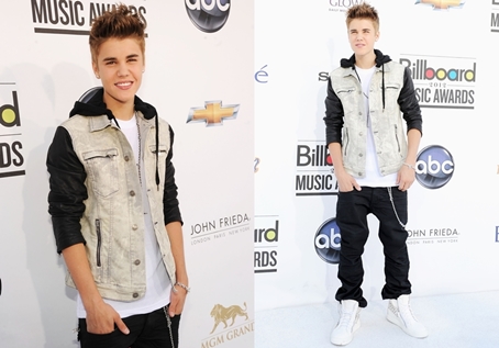 Igazán frissre és üdére sikeredett Justin 2012-es Billboard Music Awards-os megjelenése Vegasban. Egy farmer, illetve bőrhatású kabátot viselt, alatta fehér pólóval és fekete nadrággal, fehér szegecses cipője pedig Giuseppe Zanotti érdeme. Az énekes hű maradt „swag”-es kinézetéhez, de nem vitt túlzásba semmit sem, így nem csak a Top Social Artist díjához tudunk gratulálni, hanem a megjelenésének is.