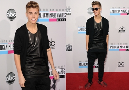 Biebs hatalmas sikereket ért el a 2012-es AMA-n – legalábbis zenei téren, a ruhája ugyanis már hagyott némi kivetnivalót maga után. A fekete bőrtrikó és nadrág a Kemal + Karla érdeme és eddig semmi baj nem lenne a megjelenésével, de Justin ismét keverte a stílusokat: bőrszerkójához egy pamut Dior kardigánt választott, amit egy piros szegecses Unif cipővel és csillogós gyémánt karkötővel párosította, amit Loree Rodkin tervezett.