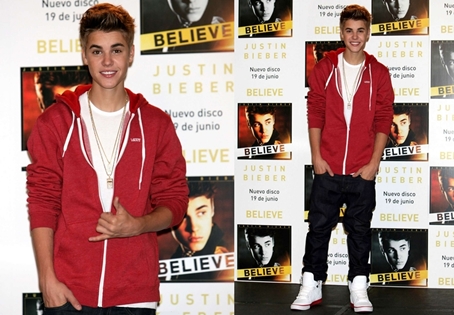 Justin lazára vette a figurát Madridban, a Believe albuma népszerűsítési kongresszusán. Piros-fehér Vans pulóverét, egy fehér pólóval, egy sötétkék farmerrel és a felső színéhez illő Supra cipővel dobta fel. Természetesen azért hű maradt magához és az aranyláncokat nem tudta elfelejteni, de összességben jól nézett ki és nem esett túlzásokba.