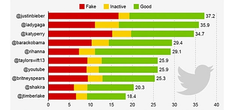 Természetesen nem ők az egyetlenek: Katy Perry, Barack Obama, Rihanna, Britney Spears, Justin Timberlake és Shakira követőinek nagy része sem létezik. Az alábbi diagramon a piros szín jelzi a kitalált, a sárga az inaktív, a zöld pedig a mai napig aktív rajongókat.