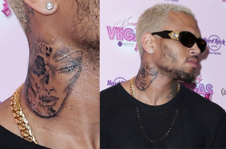 Az összevert nő – Remek címe lehetne egy festménynek is, de jelenleg Chris nyakán elhelyezkedő tetkójáról beszélünk. Nem is lenne akkora probléma, ha a nők elleni erőszak-ellenességet (vagy a nők elleni erőszakot?) reklámozná, a gond csak az, hogy a tetkó kísértetiesen hasonlít az összevert Rihanna képére.