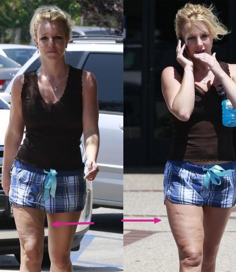 Az énekesnő lába csupa cellulit és háj, a legutóbbi róla készült képeken akár egy idős asszonnyal is felvehetné a versenyt.