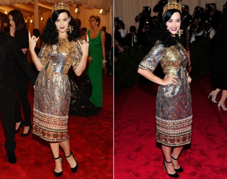 Katy Perry-nek nem teljesen volt világos, mit is takar a punk stílus, így ő egyedileg értelmezte a feladatot, és a New York-i útján beszerzett Dolce&Gabbana-ruhát öltötte magára, amelyben úgy festett, mint aki időutazáson vett részt. Katy kétségtelen érdekes színfolt volt a szőnyegen, arany koronájáért pedig imádjuk.