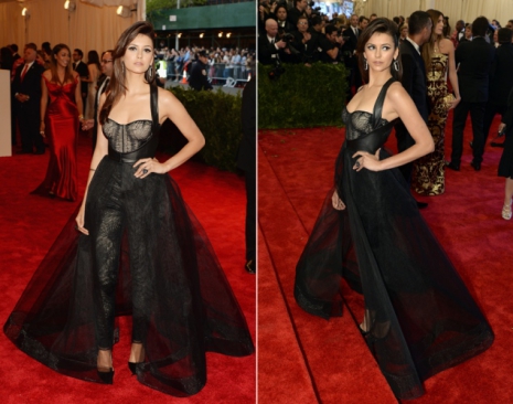 Nina Dobrev egy érdekes Monique Lhuillier-overált választott, amely oldalról estélyinek néz ki. A színésznő igazi dívaként, emelt fővel viselte a darabot, így nem tudjuk érte elítélni.