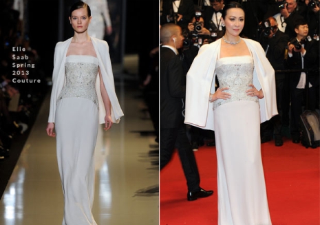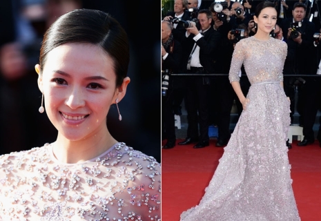 Zhang a La Venus a la Fourrure premierje során jelent meg ebben az Elie Saab-estélyiben, amelyet a tavaszi kollekcióból választott a stylistja. A lélegzetelállító ruhához Boucheron-ékszereket és egy Omega-karórát társított, s úgy festett, akárcsak egy igazi hercegnő.