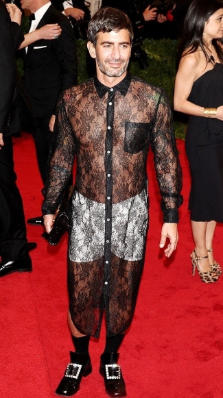 A tervezőt elcsíptük, amint épp a divatot próbálja diktálni – legközelebb talán sikerrel jár, ez az áttetsző, hálós fekete ing és a fehér alsónadrág a kobold cipőkkel szót sem érdemel...