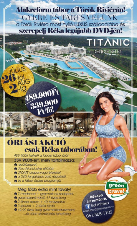 Réka már egy jó ideje népszerűsíteni igyekszik hivatalos Facebook-oldalán a július 26-án induló Alakreform tábor előnyeit. A részt vevői ugyanis amellett, hogy pompás panorámában gyönyörködhetnek a Török Riviérán, egy mesés, mindennel felszerelt hotelben, a Titanic Deluxban lesznek elszállásolva.