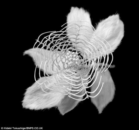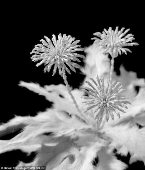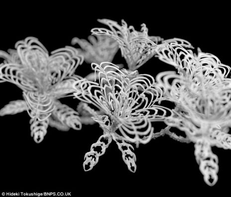Az előkészület viszont nem napokat, hanem a legtöbb esetben hónapokat vesz igénybe, mivel a csontokat használható állapotba kell tennie. Hideki már számtalan remekművet készített, köztük liliomot, lótuszt, pitypangot és hortenziát is – egy-egy alkotása több száz apró csontból készül!