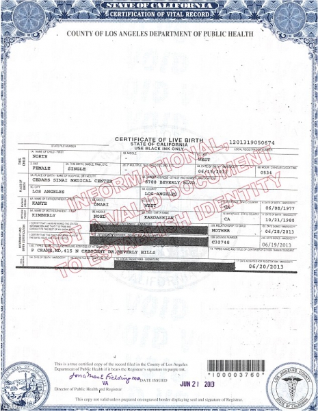 A Los Angeles megyei születési anyakönyvi kivonat szerint a kis North Los Angelesben született, a Cedars Sinai Medical Centerben június 15-én, hajnali 5.34-kor. Az irat szerint nincs középső neve, és nincs feltüntetve sem a szeme, sem a haja színe.