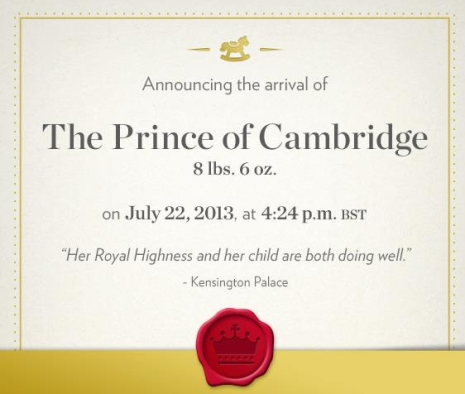 Vilmos herceg és Katalin hercegné kisfia makkegészségesen látott napvilágot, 3,8 kilóval a St Mary Kórházban, Londonban, 4 óra 24 perckor, július 22-én. A hivatalos bejelentést néhány perce tették közre a Buckingham-palota előtt, a baba születésénél a pár szeretett barátai és persze a családja is részt vett.