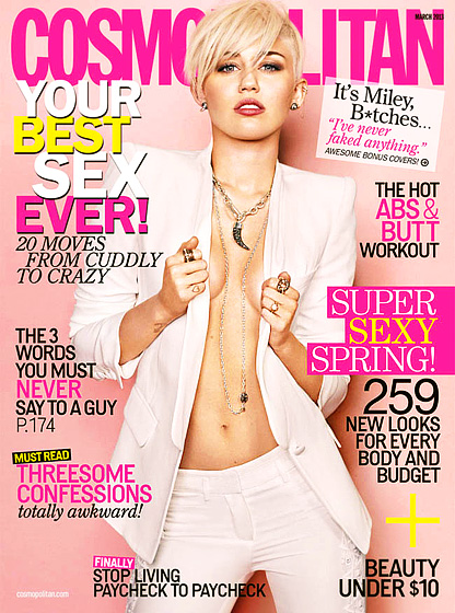 Az ártatlan Miley-ból vadító bombázó lett 2013-ra, s ezt nem csak öltözködésében nyilvánítja meg: sorra kapja a kritikákat, ám mégis bevállalt jó pár merész címlapot, s videoklipet. A Cosmopolitan magazin márciusi számában például Miley melltartó nélkül pózolt a kamerának.