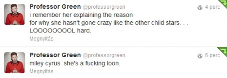 A brit rapper, Professor Green saját Twitter-profilján fejtette ki a véleményét a fiatal énekesnőről. Stephen szerint Miley egy majom lett, és olyan régi mondását hozta fel, amikor is arról beszélt, hogy miért nem szállt el magától gyerekkorában.