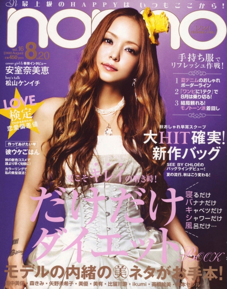 A 35 éves énekesnő csak úgy tündököl a NONNO magazin 2008-as augusztusi számának borítóján! A gyönyörű Suzuki Takayuki-ruha pompásan áll Namién, megjelenését H.P. FRANCE Bijoux-ékszerekkel fokozták a stylistok. A kicsi sárga kalap pedig márcsak hab a tortán.