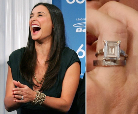 Demi és Ashton Kutcher folyamatosan tagadták eljegyzésükről szóló pletykákat, két évnyi randizgatás után kimondták a boldogító igent titokban 2005 szeptemberében. A pletykák szerint az öt karátos smaragd-gyémánt gyűrű 250 ezer amerikai dollárba került, ami átváltva 25 millió forintra tehető.