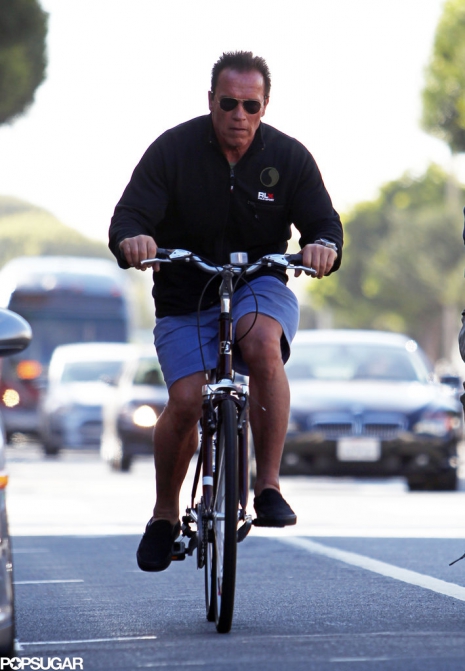 A 2003-tól 2011-ig Kalifornia állam kormányzójaként is ismert színész áprilisban járta kétkerekűjével Los Angelesben az utakat, sortja és melegítőfelsője alapján valószínűleg egy kisebb túrát tett a városban.