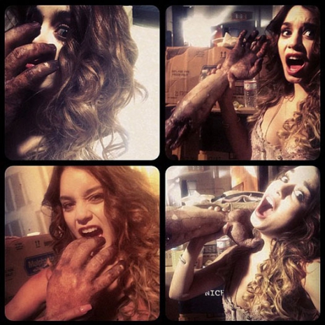 Vanessa Hudgens jelenleg keményen dolgozik az egyik új filmjén, a Kitchen Sinken, melyben három tizenéves próbál zombik és vámpírok ellen harcolni. Vanessa megosztott egy igen bohókás kollázst: „Hogyan szórakoztatom a forgatáson: #kamutestrészekkel”