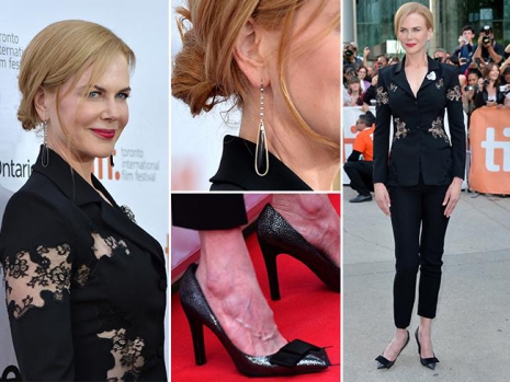 A vörös szőnyeg veteránja ezúttal is tökéletes összeállítást választott: egy üzleti megjelenést kölcsönző, kivágott, virágos-hálós részekkel díszített Altuzarra-kosztümöt viselt, amikor megjelent a The Railway Man premierjén. A cipője és fülbevalói sem hagynak kivetnivalót maguk után.