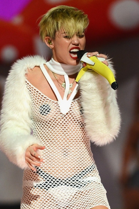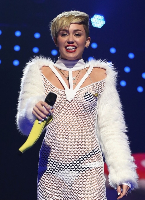 Miley Cyrus kacsingatva, nyelvét öltögetve lépett a közönség elé a 2013-as iHeartRadio Music Festivalon szeptember 21-én, szombat este az MGM Grand Garden Arénában, Las Vegasban.