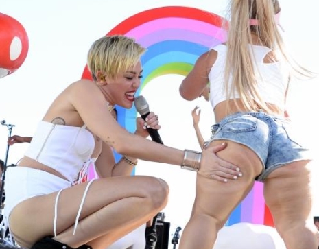A fesztivál első napján számos előadó fellépett már, ezúttal a húszéves énekesnő szórakoztatta a résztvevőket – legújabb dalát, a Wrecking Ballt is előadta, mindössze bimbótapaszok akadályozták meg, hogy megpillanthassuk melleit.