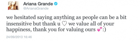 Ariana pedig így válaszolt Nathan kiírására: „Ugyan hezitáltunk, mire végül elmondtuk, de köszönjük a jókívánságokat. Értékeljük, hogy örültök nekünk, és köszönjük, hogy értékelitek a kapcsolatunkat!”