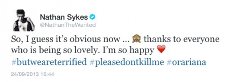 A The Wanted énekese, Nathan Sykes és a Victorious színész-énekesnője, Ariana Grande ma hivatalosan is bejelentette: egy párt alkotnak!