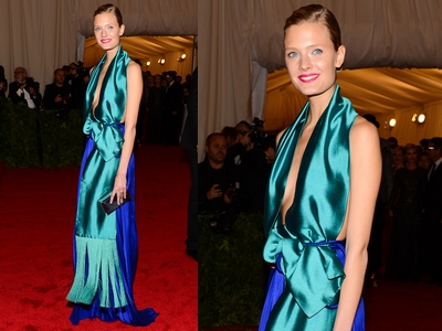 Talán jobban tenné Mademoiselle Jablonski, ha inkább kihagyná a MET Gálát, ha folyton ilyen kreációkban jelenik meg. A tavalyi estélyen tette tiszteletét a modell ebben a kék-zöld Haider Ackerman-ruhában, mely mélyen dekoltált, túl hosszú, és a felső része olyan, mintha egy egyszerű selyemsál lenne, amit rákötöttek a kék szoknyaalapra. Nem értjük miért pont ezen a ruhadarabon akadt meg a szépség szeme, de bízunk benne, hogy legközelebb messzire elkerüli az ehhez hasonló a darabokat!