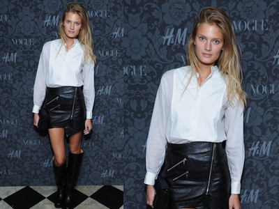 A H&M és a Vogue egyik közös rendezvényén mutatkozott a modell ebben a szettben, mely természetesen a H&M-ből való. A szexi, bőr miniszoknyát ügyesen ötvözte egy elegáns fehér inggel, a hosszúszárú lovagló fazonú csizma pedig csak a pont az „i”-n. Ismét tudta hogyan kell ízlésesen, ám mégis merészen összeválogatni szettjét.