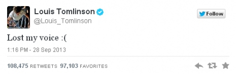 Szombaton Louis elég rosszul érezte magát, és ezt tweetelte ki:„Elvesztettem a hangom”. Ezzel nem is lenne semmi gond, ha nem a világ egyik leghíresebb fiúbandájának lenne tagja, és nem a világkörüli turné kellős közepén járnának – sokan azt gondolják, ez egy égi jel, hogy többet ne énekeljen.