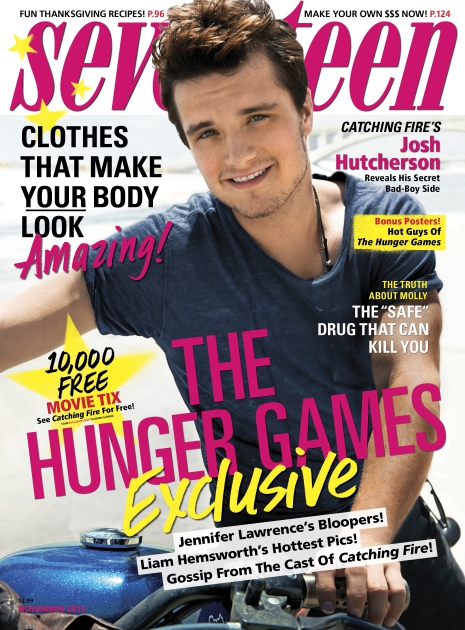 Josh Hutcherson mosolya villan fel a Seventeen magazin novemberi számának címlapján. A 20 éves színész az Éhezők viadalának második részéről, a Futótűzről, szívfájdalomról és más lányokkal való randevúzásról is mesélt a magazinnak