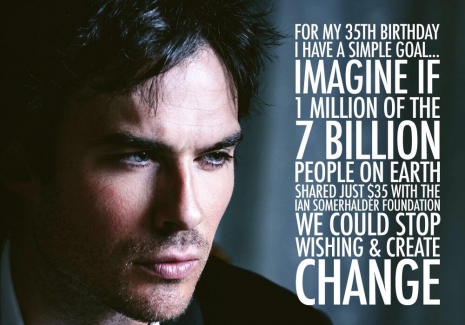 Nem csak a papírra írott levelekről próbálja leszoktatni rajongóit, hanem minden évben azt kéri tőlük születésnapjára, hogy a neki szánt ajándékok árát inkább jótékony célra költsék. Idén sincs ez másképp, hiszen kevesebb, mint két hónap múlva tölti be 35. életévét, így néhány napja saját alapítványának, az Ian Somerhalder Foundation oldalán közölte ez évi terveit, kéréseit egy hosszú és tartalmas bejegyzésben.