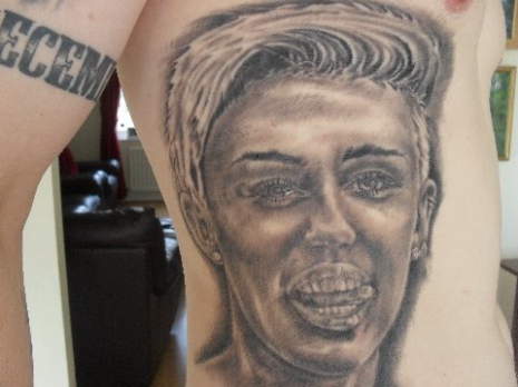 „A 20. tetkóm nemrég készült el, Miley portréja van rajta a kidugott nyelvével együtt. A bordáimra tetováltattam ezt a képet, elég fájdalmas volt. Eddig ez a kedvencem. Úgy gondoltam, ezt a képet muszáj magamra tetováltatnom, hiszen jelenleg is így néz ki Miley, és múlt év óta ilyen a haja is. Így olyan, mintha velem lenne.”