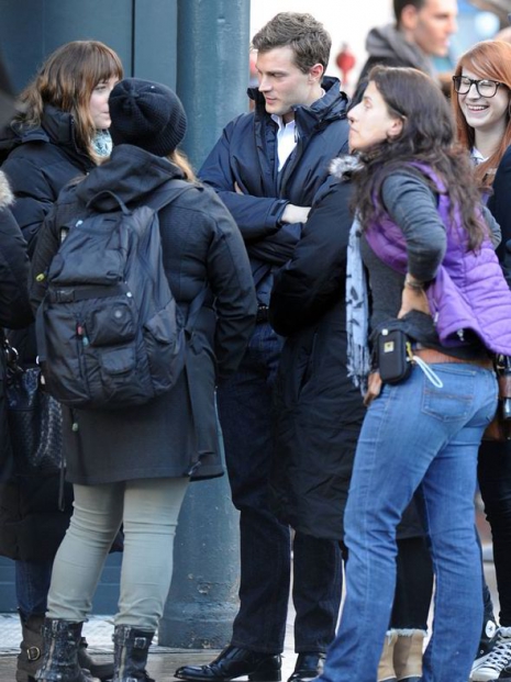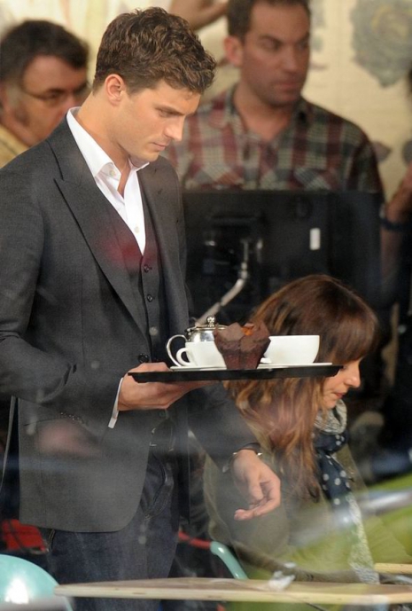 Tegnap hivatalosan is megkezdődött a 50 Shades of Grey filmadaptáció forgatása. Egyelőre nem az ágyjeleneteket forgatják, az első képkockákat egy kávézóban vették fel, ahol Dakota (Anastasia Steele) egy alkalmi kekizöld kabátban, mintás sálban és farmerban volt látható, ameddig a 31 éves Jamie (Christian Grey) nagyon elegánsan festett egy sötétszürke blézerben.