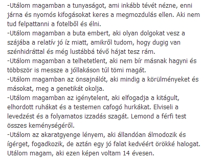 Utolsó mondatában elmondta, nem utálja a kövér embereket, sőt, segít nekik győzni a túlsúllyal szemben, hogy felülkerekedjenek azon, aki bennük él, és akit önmagában is utál.