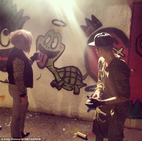 Az énekes graffitileckéket adott, nem is akárkinek: Kelly Osbourne-t arra tanította, hogyan firkáljon össze egy falat.