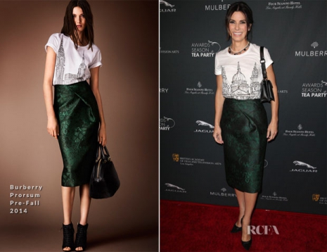Sandra Bullock Burberry Prorsumot választott tegnap estére, a 2014-es elő-őszi kollekcióból a BAFTA LA 2014 Awards Season Teapartira, amelyet a Négy Évszak hotelben rendeztek meg Beverly Hillsben, Los Angelesben. Lábbelit a Casadeitől kölcsönzött, valamint az óriás táskát is egy kisebb retikülre cserélte. Nekünk bejön!
