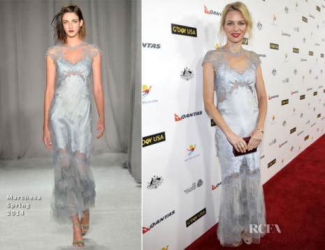Naomi Watts a G’Day USA Los Angeles Black Tie gálán vett részt január 11-én, amelyet a JW Marriott Hotelben rendeztek meg Los Angelesben. A Marchesa tavaszi kollekciójából választott egy szaténruhát, retikült pedig a Rauwolftól kölcsönzött.