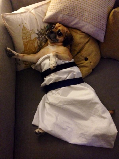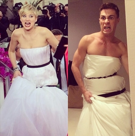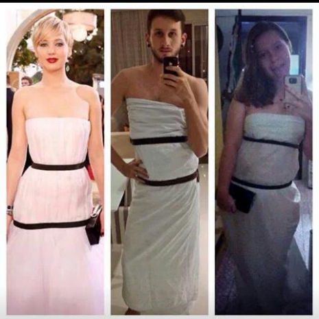 Természetesen a netezőknek több sem kellett: még a gála ideje alatt nekiláttak a kreatív munkának, és elkészítették saját ruhakölteményeiket, voltak, akik modellé avanzsált házikedvencükön át mutatták be extravagáns alkotásaikat, de még Colton Haynes is J-Law bőrébe bújt egy fotó erejéig.