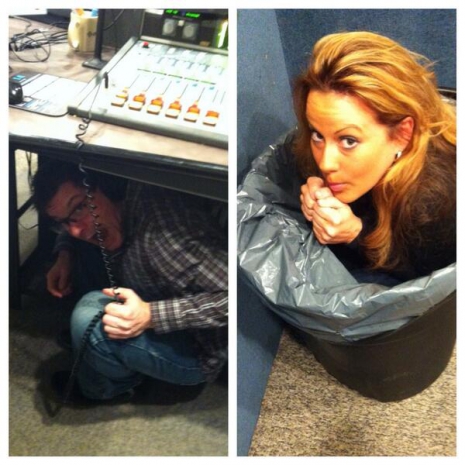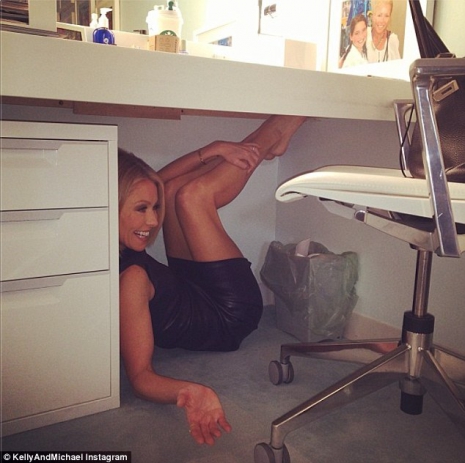 Kelly, lábait felemelve, egy íróasztal alá bújt, majd a képet megosztották hivatalos Twitter- és Instagram-fiókjaikon is.