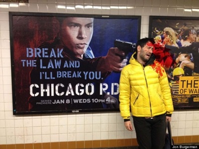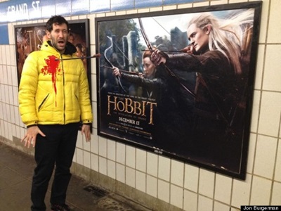 A Brooklynból származó Jon éppen Szöulban kalandozott, amikor elkészítette egyik figyelemre méltó művét Bruce Willis plakátja előtt, következő fotóján pedig már az Éhezők viadala sztárja, Jennifer Lawrence lövi át a művész fejét egy nyíllal.