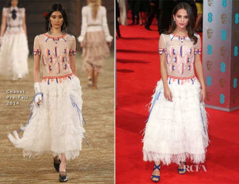 Alicia egy enyhén western/indián hatású Chanel-költeményben jelent meg a gálán, amely a 2014-es elő-őszi kollekció egyik darabja, hozzá Jimmy Choo ‘Xenia’ cipellőit választotta, de a megjelenése inkább humoros, mint előnyös.