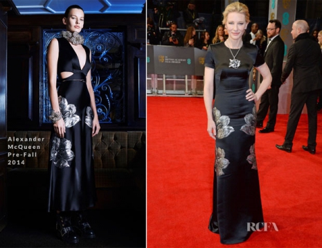 A Blue Jasmine sztárja, akit jelöltek mint legjobb női főszereplő, egy kézi szabású Alexander McQueenbe bújt, amelyet a 2014-es elő-őszi kollekcióból választott. Kiegészítőként egy Chopard-nyakláncot és Jimmy Choo-cipőket viselt.