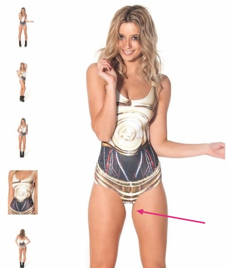 Az Adam & Eve 2009-ben népszerűsített kollekciójának alábbi darabja ugyan roppant megnyerő, a modell már kevésbé nyeri el tetszésünket, különösen deformált, helyéről kipattant combjai miatt. És... lóg valami a lába között? Erre inkább nem szeretnénk rájönni.