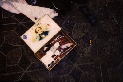 Az egyik képen egy kis cigarettadobozt láthatunk, mely egy heroinmaradékos kanalat, tűket és egyéb, drogos kelléket tartalmaz; ettől nem messze pedig egy elszívott cigarettacsikk látható.