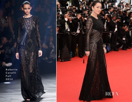 Gong a Grace of Monaco premierjén viselte ezt a Roberto Cavalli-, őszi kollekciós fekete, tüllcsíkokkal és gyöngysorszabásokkal megtűzdelt, nyitott hátú dresszt, amelyhez gyémántékszereket és Gucci-cipőt választott.