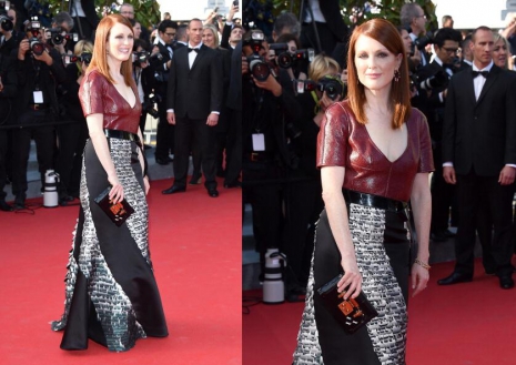 A színésznő a Mr Turner vetítésén jelent meg május 15-én ebben a kézi szabású Louis Vuittonban, mely a 2014-es őszi kollekcióban kapott helyet. Julianne általában nem bízza a véletlenre megjelenését, és mindig lenyűgöz minket, akárcsak most; a vörösbor színű bőrrészhez tökéletesen illett a spirális szoknya, amit szaténnal dobtak fel. A Chopard-ékszerek mellé Louis Vuitton-, fekete ‘Epi Electric Petite Malle’ retikül és fekete LV-bőrszíj társultak.