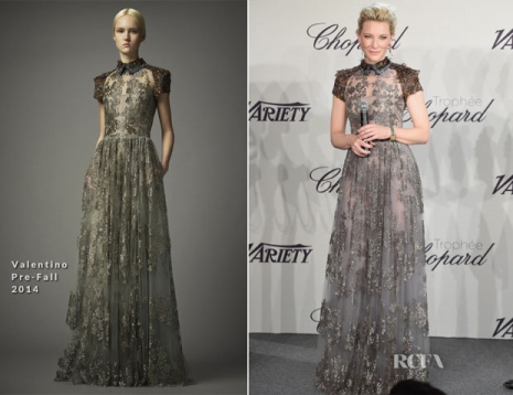 A Blue Jasmine sztárja egy szürke Valentinóban tette tiszteletét a második napon, melyet ezüstszínű, metálos virághímzés és tüll anyagú szoknyarész dobott fel. Szettje Chopard-ékszerekkel egészült ki.
