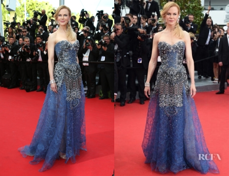 A délután folyamán Nicole ruhát cserélt; az esti bemutatón már ezt az Armani Privé-estélyit viselte, mely a 2014-es tavaszi kollekcióban kapott helyet. A pánt nélküli kék költemény egyszerűen fenomenális, az ezüst-részletezés pedig kivételes, bár bizonyára egy tonnát nyomott. Karkötője Caftan-, fülbevalói pedig Winston-gyémántok.