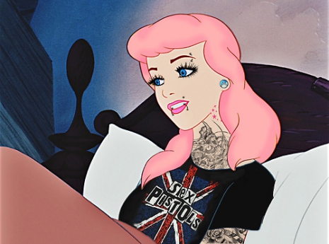 Punk Hamupipőke angol zászlós, Sex Pistol-feliratos pólóban, rózsaszín hajjal, tetkókkal és piercingekkel nyomul. Az egyetlen, amit meghagyott az alkotó, az a tengerkék szempár, ami remekül illik pink hajkoronájához.